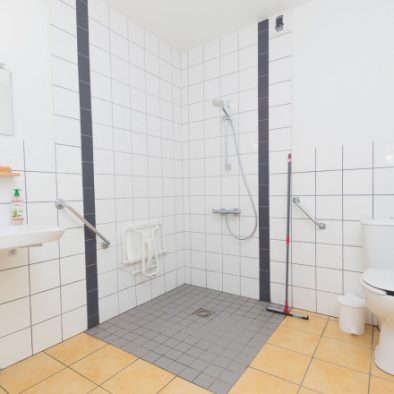 Chambre spacieuse aménagée afin de faciliter le séjour des personnes à mobilité réduite.