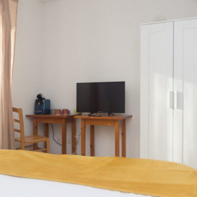 Logement de 30m2 fonctionnel avec parquet et vue sur la colline avec coin salon équipé d’un canapé, frigo, cafetière et bouilloire